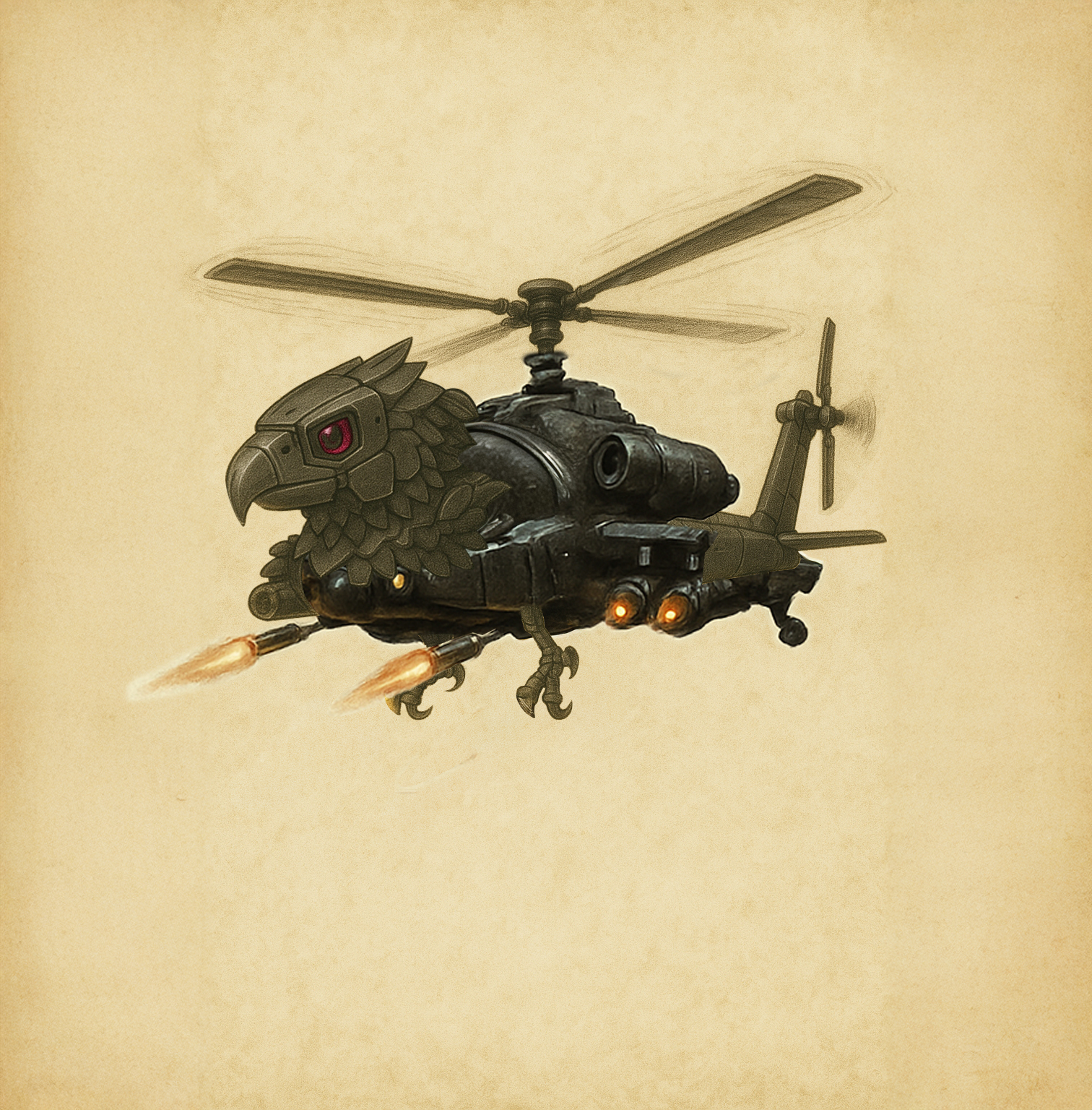 The Rotorhawk is loyal and pragmatic, often emitting low chirps that sound suspiciously like a rotating engine. It occasionally performs little “fly-by” maneuvers around campfires to show off, and tends to perch facing outward — ever vigilant, its rotors idling like a cat’s purr.
