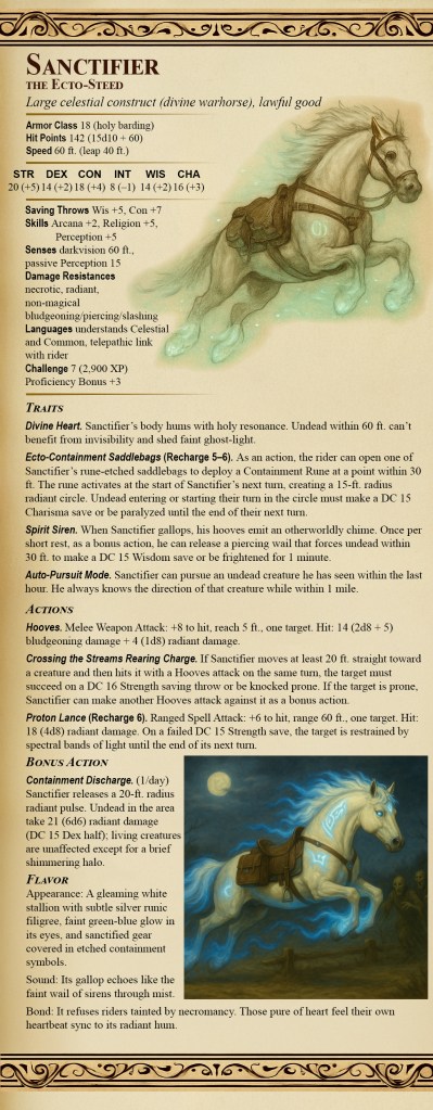 - Ecto-Containment Saddlebags. (Recharge 5–6) As an action, the rider can open one of Sanctifier’s rune-etched saddlebags to deploy a Containment Rune at a point within 30 ft. The rune activates at the start of Sanctifier’s next turn, creating a 15-ft. radius radiant circle. Undead entering or starting their turn in the circle must make a DC 15 Charisma save or be paralyzed until the end of their next turn.