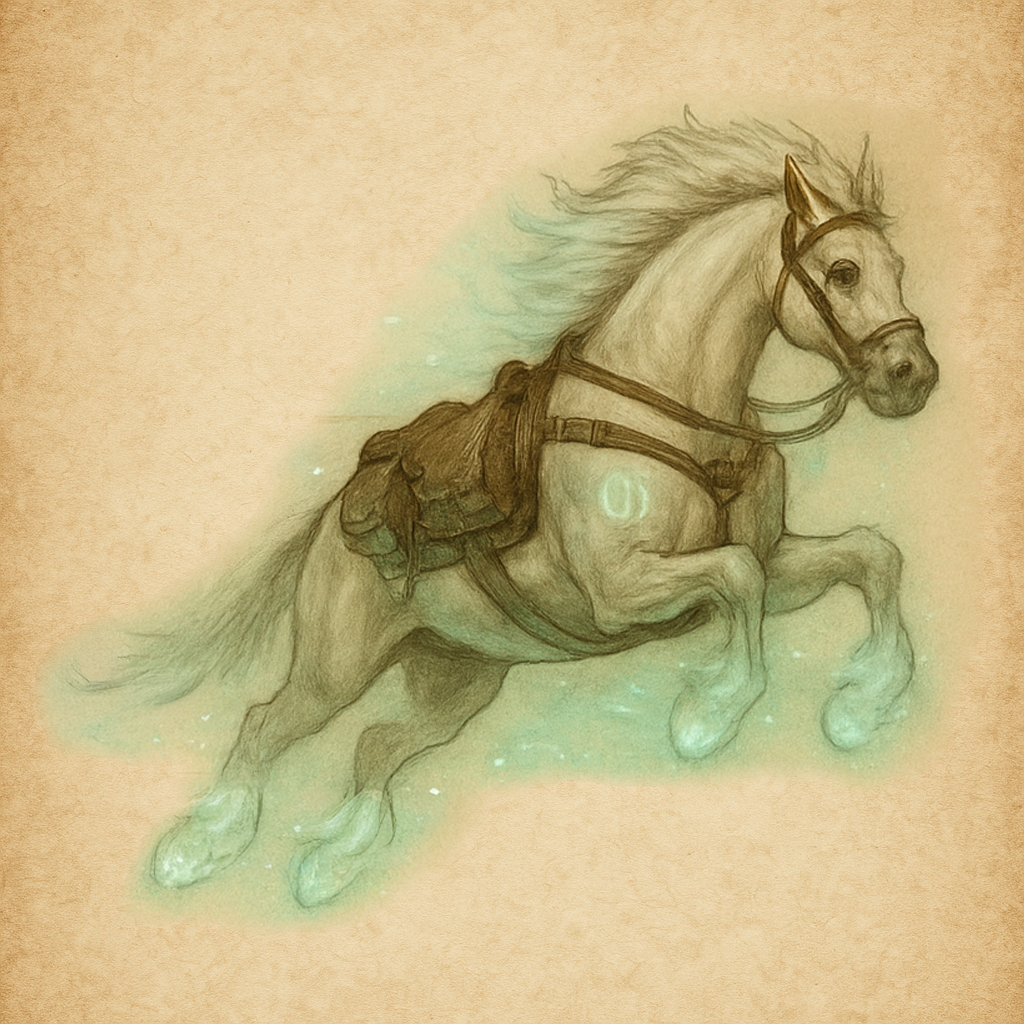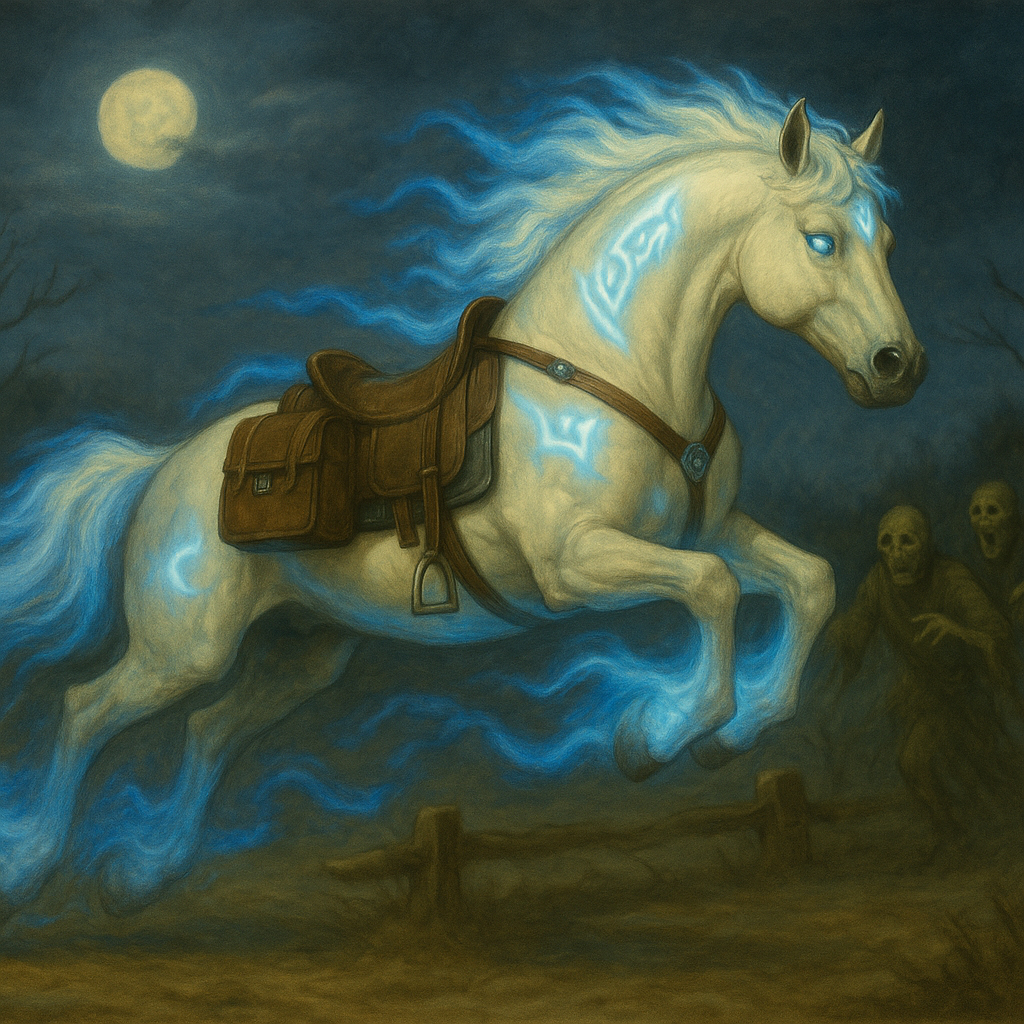 - Appearance: A gleaming white stallion with subtle silver runic filigree, faint green-blue glow in its eyes, and sanctified gear covered in etched containment symbols.