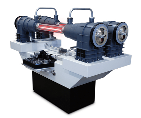 “Modern Props designed and fabricated dual medical / lab / control room generator with rotating neon lights inside an acrylic tube; light-controlled panel with knobs and buttons.”