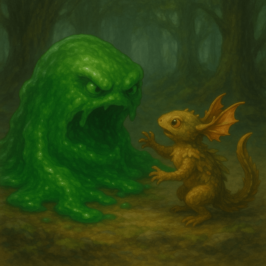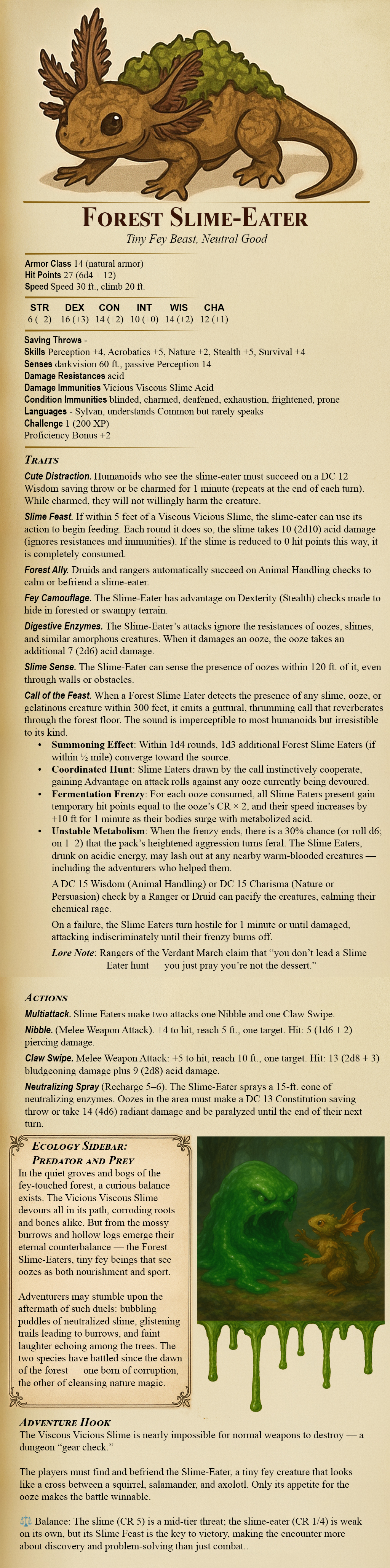 ⚖️ Balance: The slime (CR 5) is a mid-tier threat; the slime-eater (CR 1/4) is weak on its own, but its Slime Feast is the key to victory, making the encounter more about discovery and problem-solving than just combat.