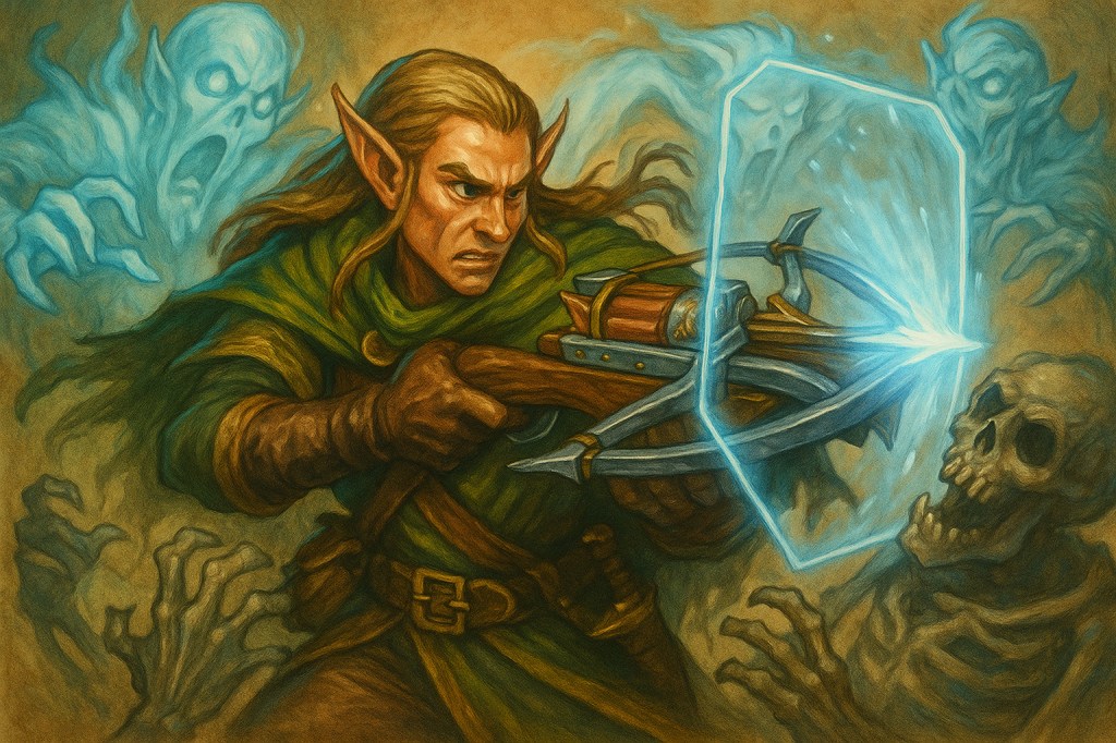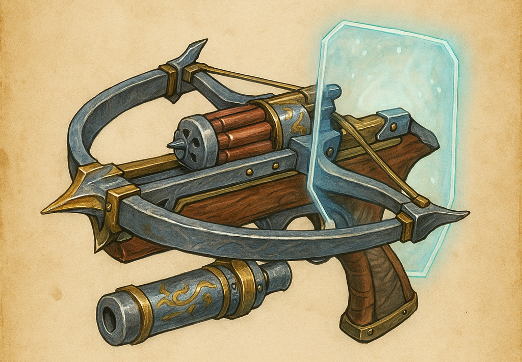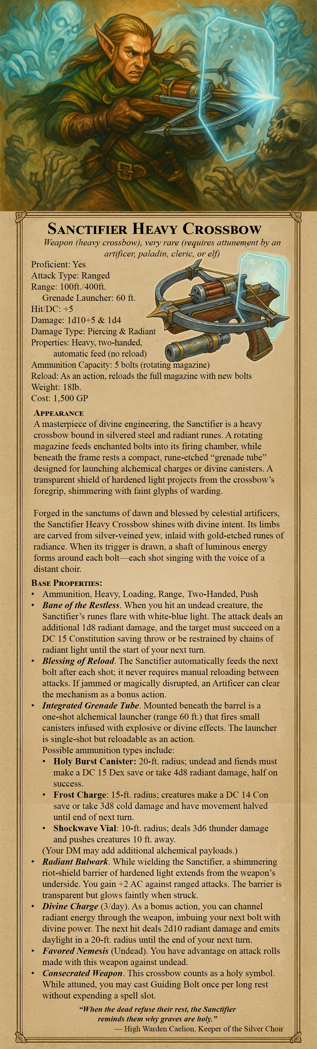 A masterpiece of divine engineering, the Sanctifier is a heavy crossbow bound in silvered steel and radiant runes. A rotating magazine feeds enchanted bolts into its firing chamber, while beneath the frame rests a compact, rune-etched “grenade tube” designed for launching alchemical charges or divine canisters. A transparent shield of hardened light projects from the crossbow’s foregrip, shimmering with faint glyphs of warding.