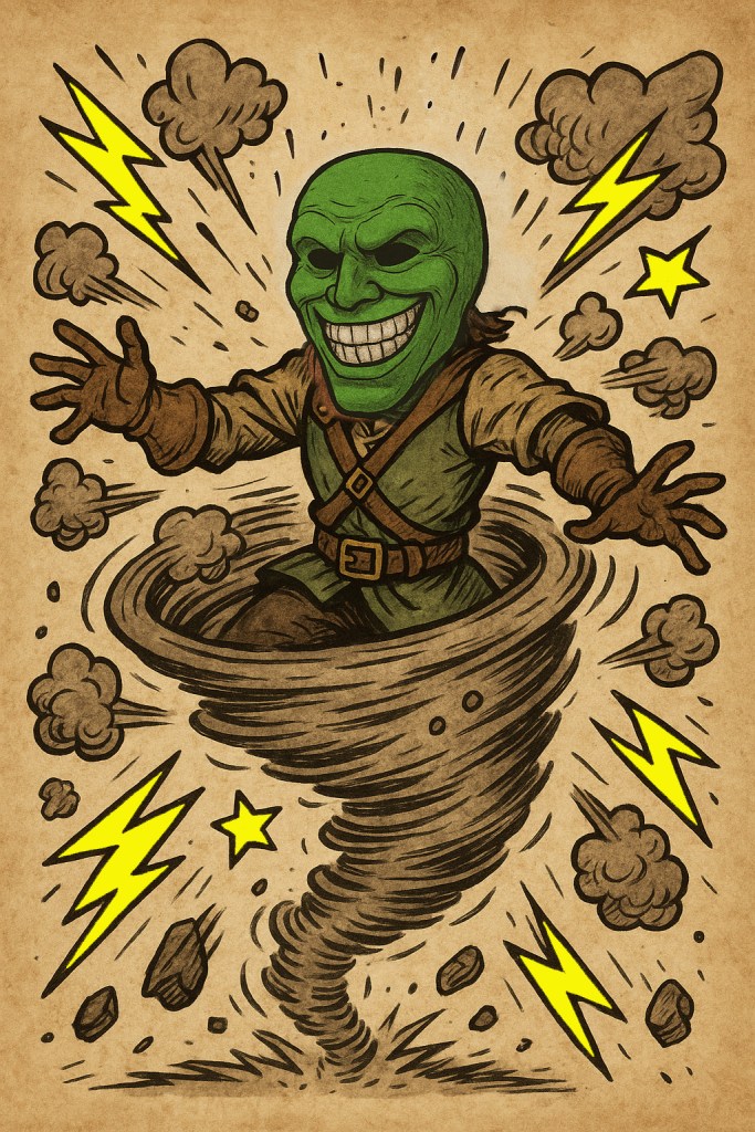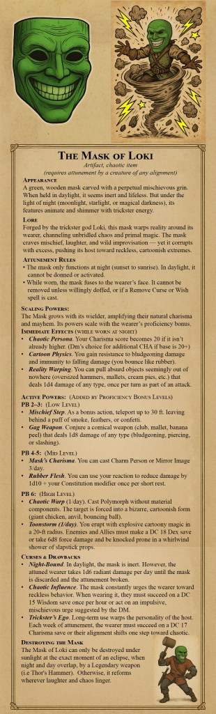 Forged by the trickster god Loki, this mask warps reality around its wearer, channeling unbridled chaos and primal magic. The mask craves mischief, laughter, and wild improvisation — yet it corrupts with excess, pushing its host toward reckless, cartoonish extremes.