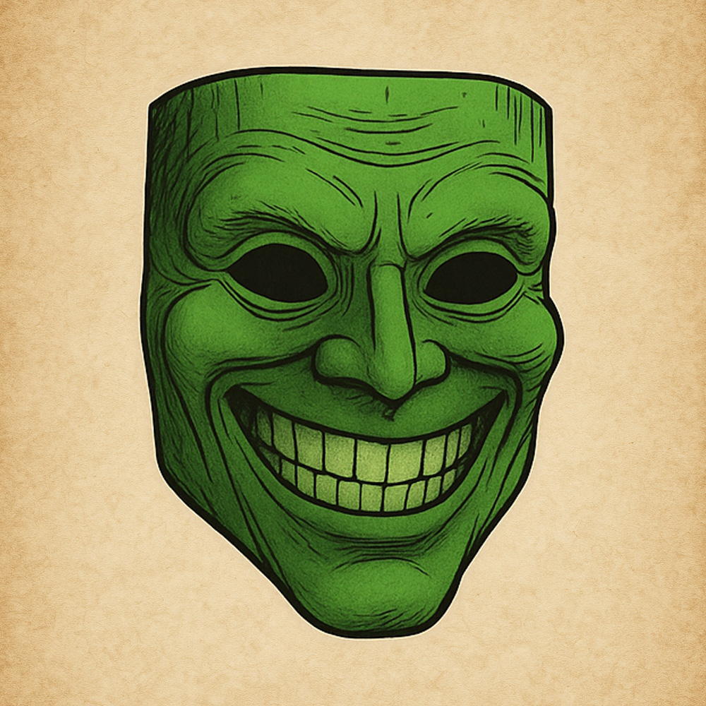 A green, wooden mask carved with a perpetual mischievous grin. When held in daylight, it seems inert and lifeless. But under the light of night (moonlight, starlight, or magical darkness), its features animate and shimmer with trickster energy.