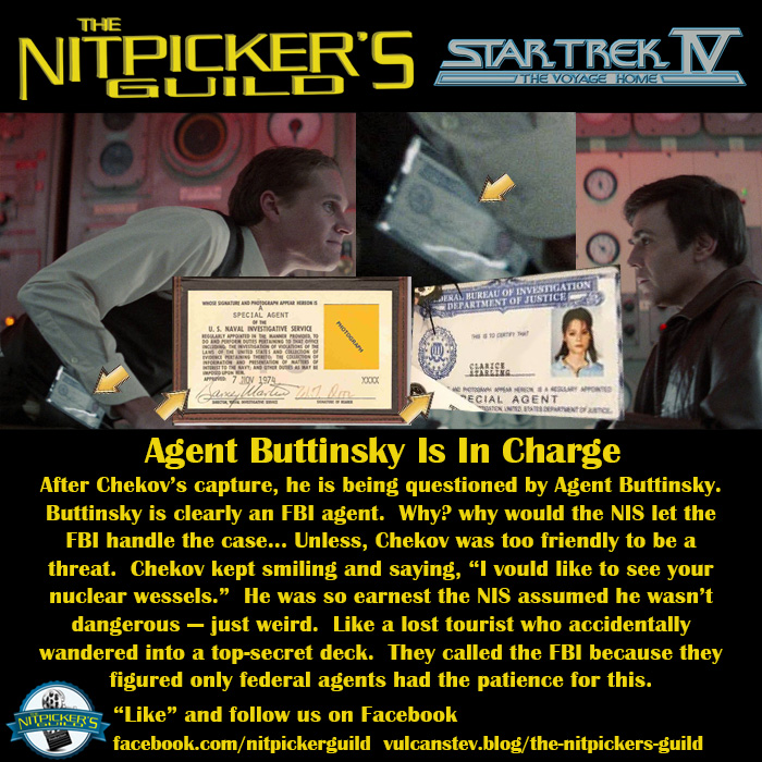 Yesterday I was speculating who this agent was that questioned Chekov. His credentials didn’t look like either NIS (Naval Investigative Service, the forerunner of NCIS and appropriate agency for the time) nor FBI. However after some investigation, it does appear that Buttinsky is an FBI agent. So WHY would the NCIS turn jurisdiction over to the FBI?