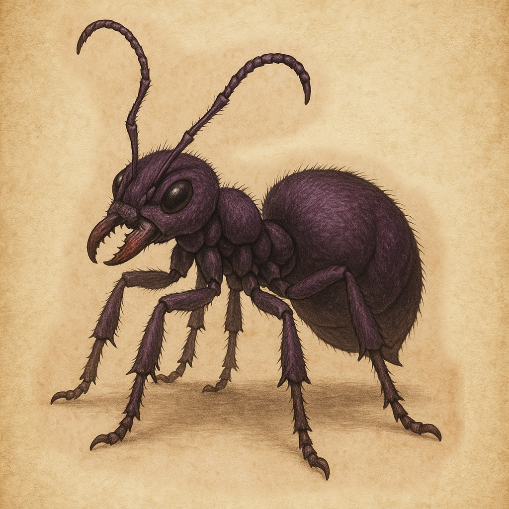 The Velvet Uch Ant Queen is a creature of unsettling elegance — a monstrous, dog-sized matriarch whose body is sheathed in the same shimmering, soft, violet “velvet” fuzz as her swarm… but magnified into something uncanny. Her carapace glows with deep purples and star-flecked blacks, subtly iridescent like polished obsidian wrapped in midnight silk. Where the common Velvet Uch worker is the size of a human thumb, the Queen towers over them like a living throne, her thorax tall and domed, her abdomen swollen and pulsating faintly with alchemical luminescence.