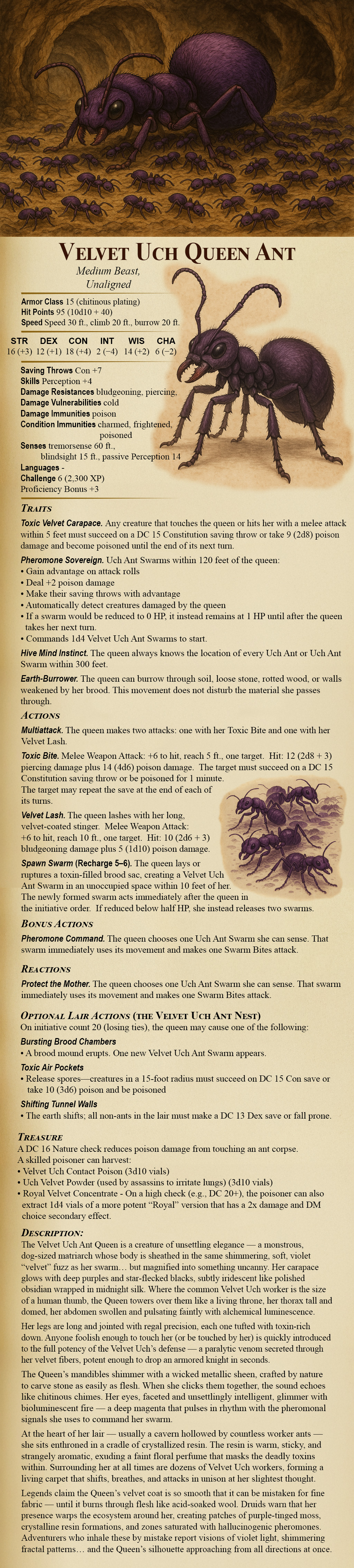 At the heart of her lair — usually a cavern hollowed by countless worker ants — she sits enthroned in a cradle of crystallized resin. The resin is warm, sticky, and strangely aromatic, exuding a faint floral perfume that masks the deadly toxins within. Surrounding her at all times are dozens of Velvet Uch workers, forming a living carpet that shifts, breathes, and attacks in unison at her slightest thought.