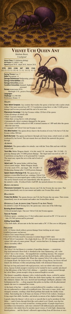 Pheromone Sovereign. Commands 1d4 Velvet Uch Ant Swarms to start.