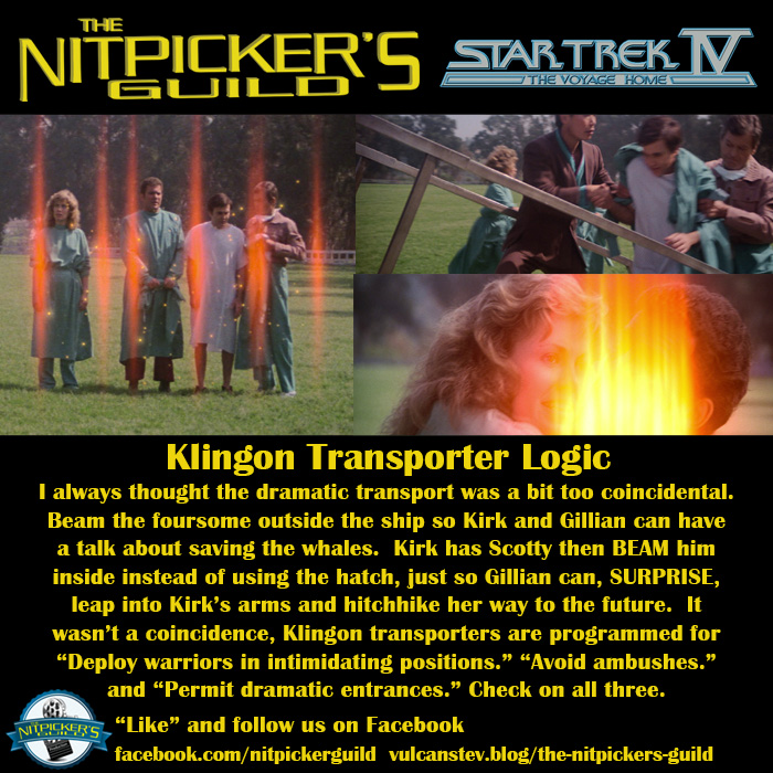 Yes, I see how structurally the crew needed to be beamed outside the ship for the whole scene to work. It made sense that the foursome had to beam to the park given the problems Scotty has been having with the transporter. But I never quite understood why, after McCoy and Chekov are escorted inside the ship by Sulu, they shut the hatch so Kirk HAD to beam in and Gillian could pull her surprise hitchhiking routine. That is until I understood the logic behind Klingon Transporters.