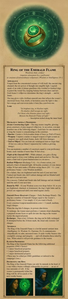 The Ring of the Emerald Flame is a lawful neutral sentient item (Intelligence 16, Wisdom 18, Charisma 18). It communicates telepathically in calm, measured tones. It seeks worthy bearers who exemplify courage and integrity — and will abandon those ruled by fear. When asked it will provide guidance to the wearer.