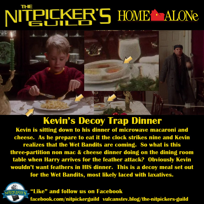 Kevin has been looking forward to his Mac & Cheese dinner all day. He sure doesn’t want that to go to waste. So Kevin has replaced HIS dinner with a decoy one. My head canon is that Kevin couldn’t predict HOW and where the Wet Bandits would enter the house and could only direct their movements once they’re inside. So there are multiple traps at laid out at every point of entry funneling the Wet Bandits to Kevin’s Coup de grâce.