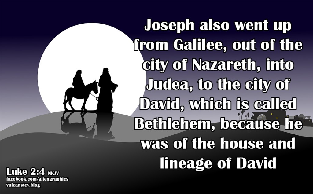 4 Joseph also went up from Galilee, out of the city of Nazareth, into Judea, to the city of David, which is called Bethlehem, because he was of the house and lineage of David, 5 to be registered with Mary, his betrothed wife, who was with child. 6 So it was, that while they were there, the days were completed for her to be delivered. 7 And she brought forth her firstborn Son, and wrapped Him in swaddling cloths, and laid Him in a manger, because there was no room for them in the inn.