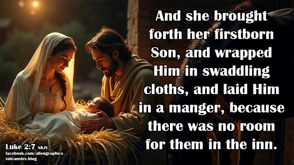 4 Joseph also went up from Galilee, out of the city of Nazareth, into Judea, to the city of David, which is called Bethlehem, because he was of the house and lineage of David, 5 to be registered with Mary, his betrothed wife, who was with child. 6 So it was, that while they were there, the days were completed for her to be delivered. 7 And she brought forth her firstborn Son, and wrapped Him in swaddling cloths, and laid Him in a manger, because there was no room for them in the inn.