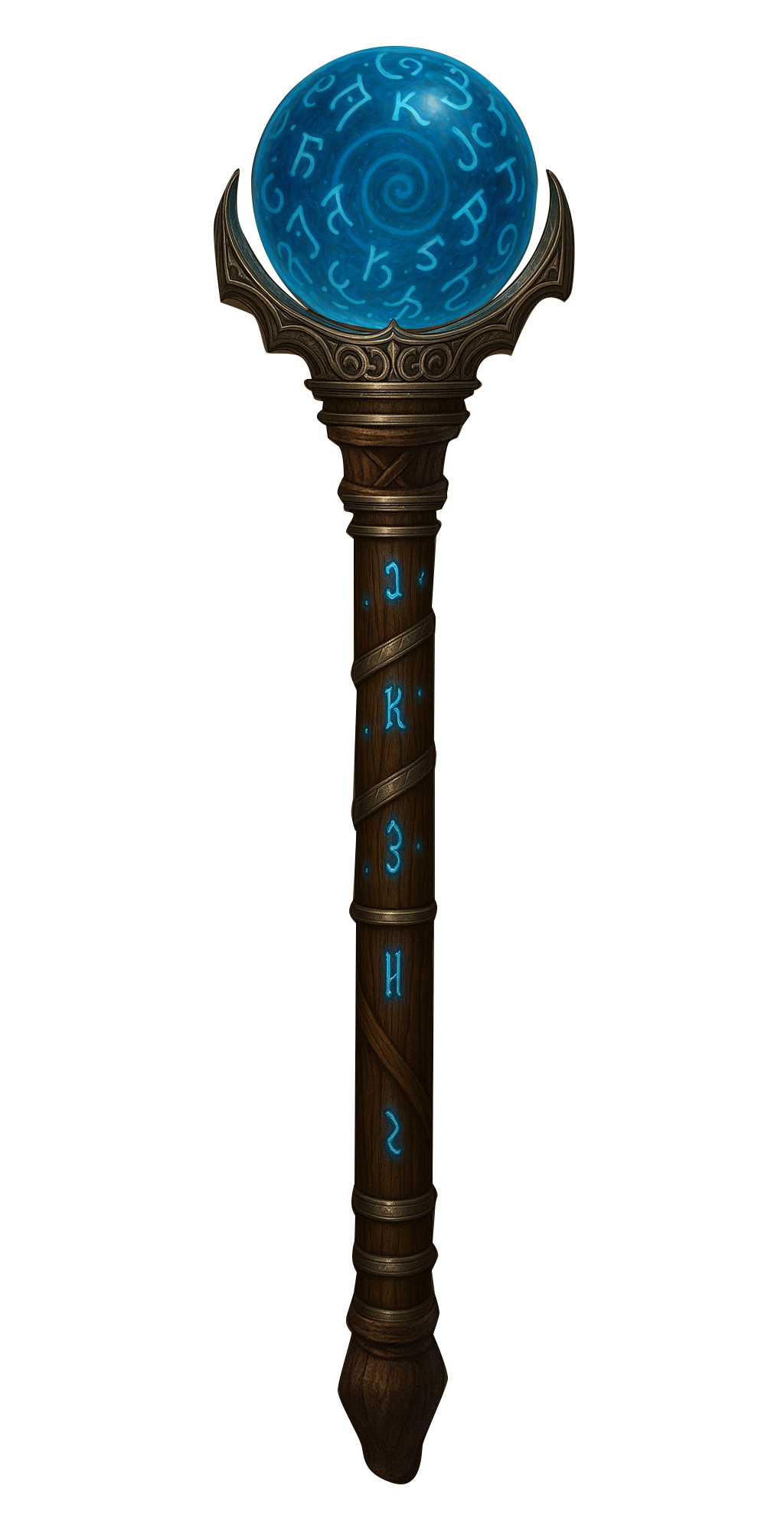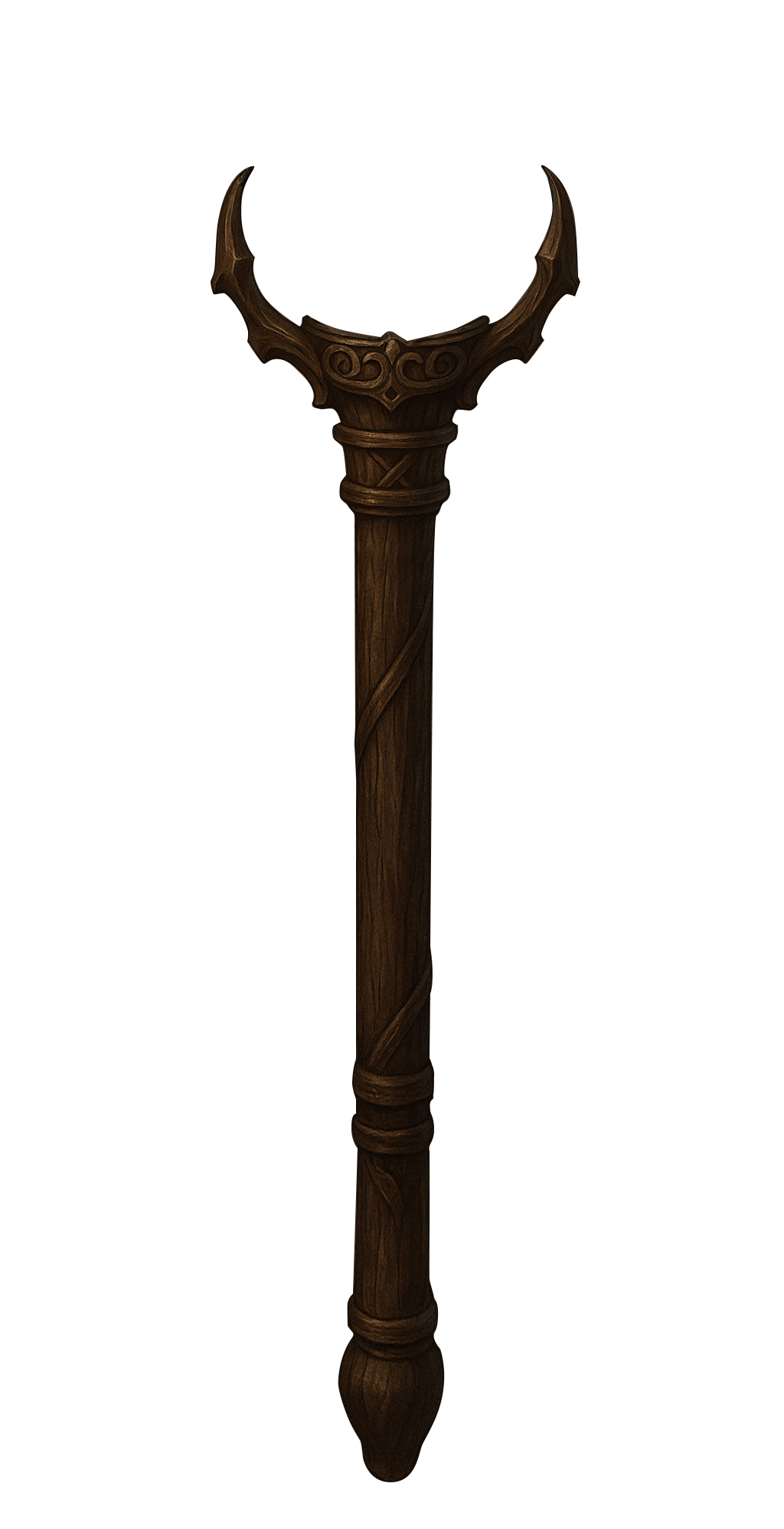 This staff is wrought of dark ironwood reinforced with adamantine bands, its length etched with spiraling runes of judgment and restraint. At its crown rests a delicate silver filigree cradle, perfectly sized to hold the Whispering Orb of Conscience.