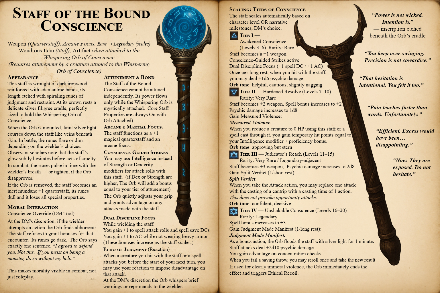 Wondrous Item (Staff), Artifact when attached to the Whispering Orb of Conscience