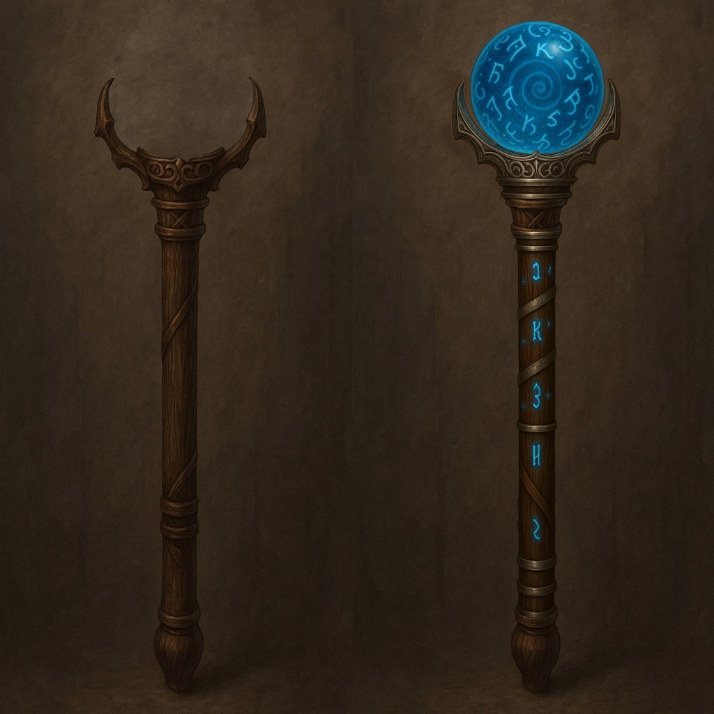 When the Orb is mounted, faint silver light courses down the staff like veins beneath skin. In battle, the runes flare or dim depending on the wielder’s choices. Observant scholars note that the staff’s glow subtly hesitates before acts of cruelty.