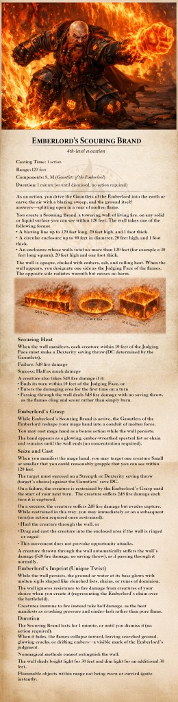 Just a bit of backstory, when I was homebrewing the Gauntlets I had D&D Beyond open and built them using spells in my library’s rulebooks, forgetting completely that the PC they were being built for doesn’t necessarily have access to the same rulebooks. Since I couldn’t just outright copy Wall of Flame to homebrew, I opted to switch it up just a bit, courtesy Nevet’s magical abilities