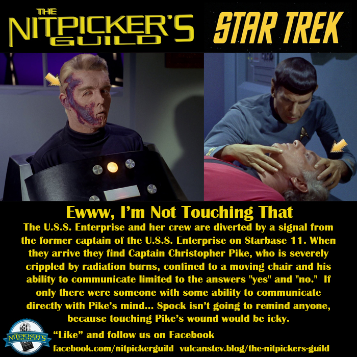 So why doesn’t Spock ever bring it up? Ewww then he’d have to touch Pike’s icky radiation burns.