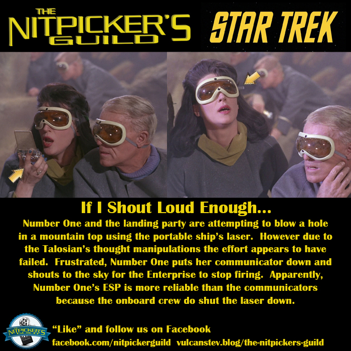 Number One knows her EPS is far more reliable than the communicators. ESP works better if you have line of sight. Number One isn’t so much shouting at the Enterprise, rather she is giving her ESPer abilities the best connection.