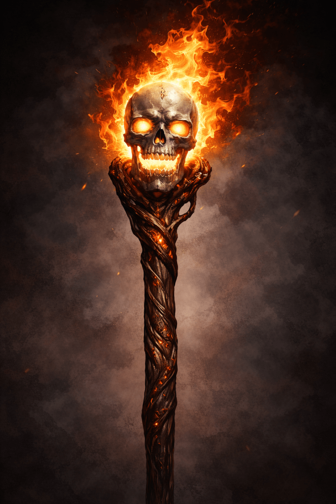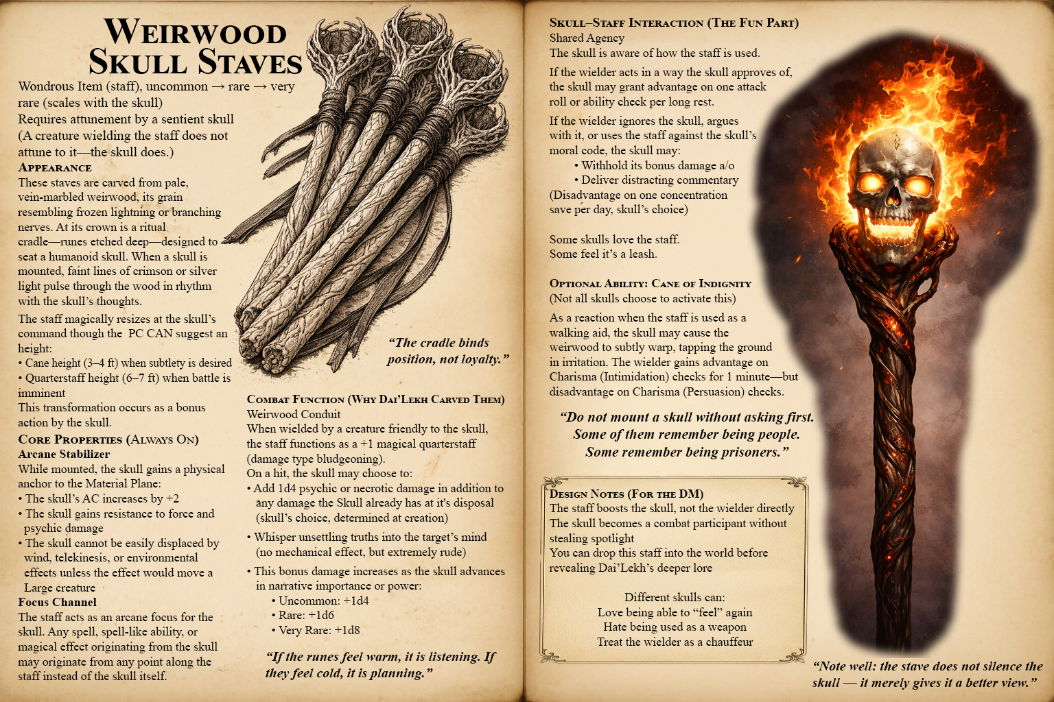 While mounted, the skull gains awareness of the wielder’s surroundings and may subtly influence the flow of magic through the staff. Prolonged use often leads to conversational bleed, where the skull’s thoughts echo faintly in the wielder’s mind — whether invited or not.