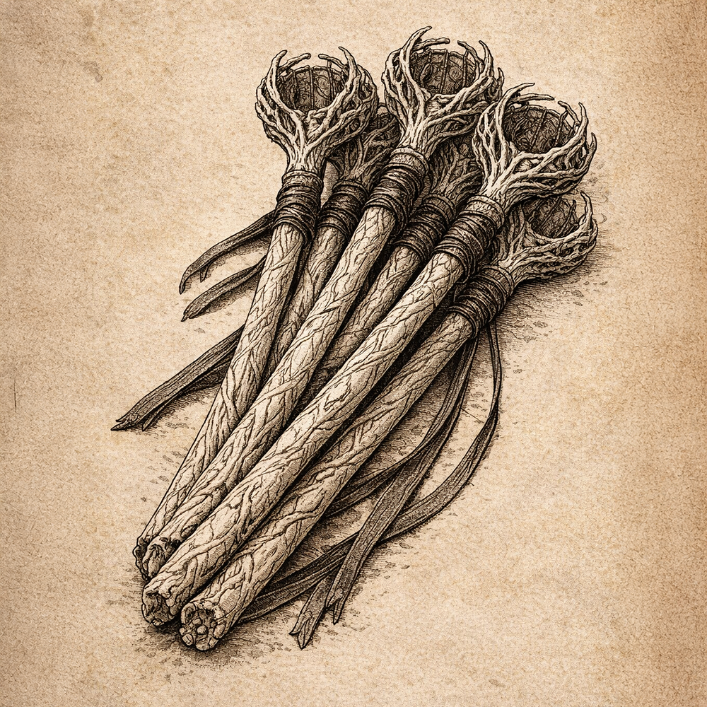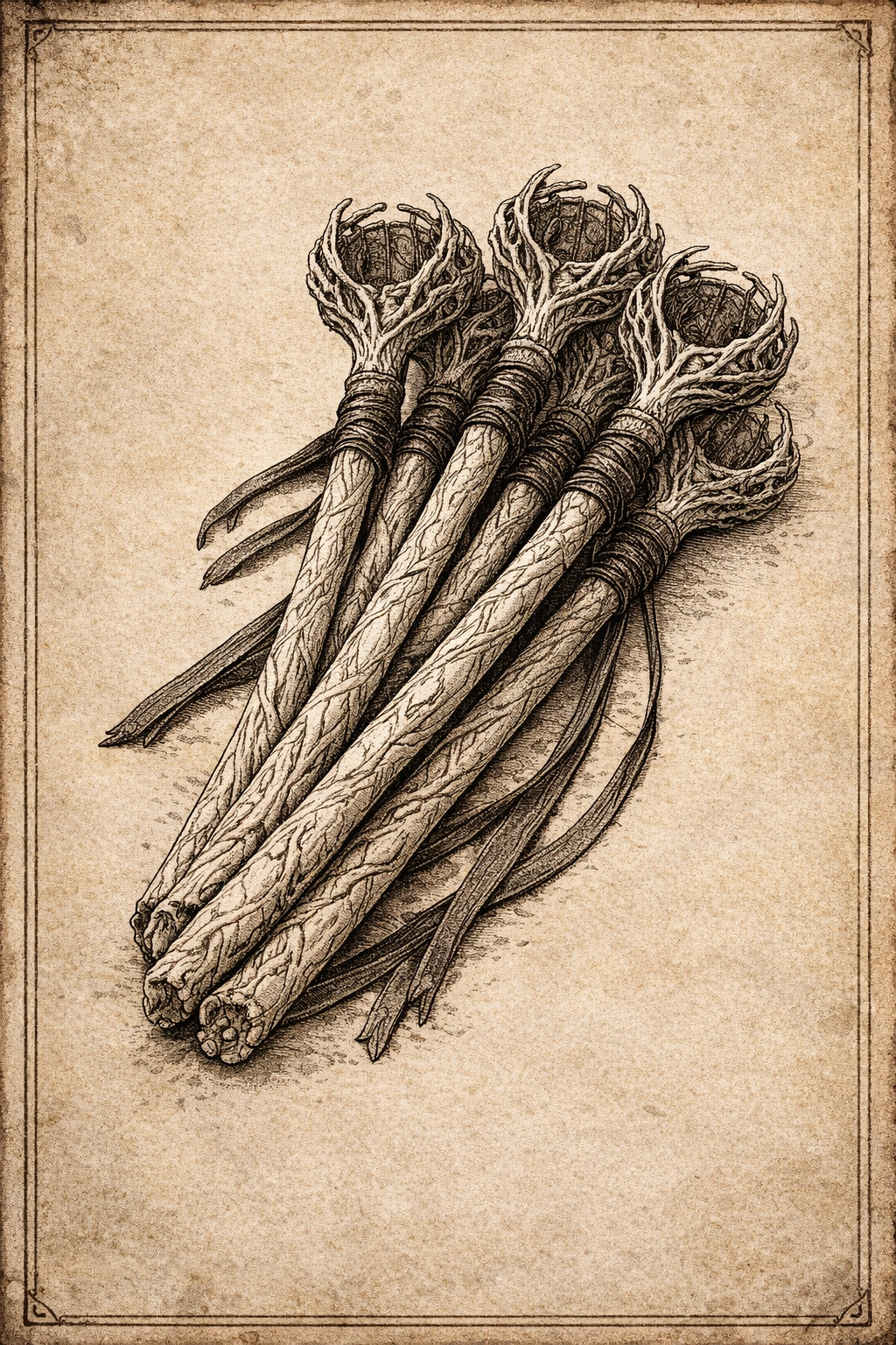 These staves are carved from pale, vein-marbled weirwood, its grain resembling frozen lightning or branching nerves beneath translucent bone. The wood is cool to the touch and faintly resonant, as though it remembers every hand that has held it.
