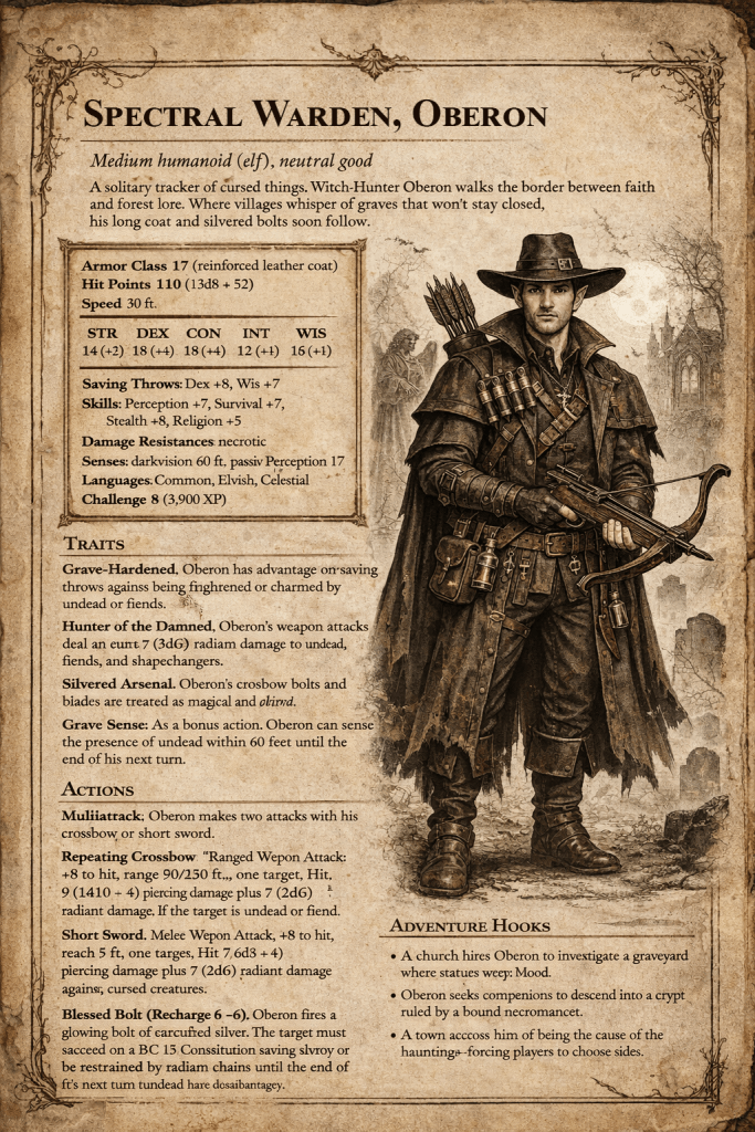 Hit: 7 (1d6 + 4) piercing damage plus 7 (2d6) radiant damage against cursed creatures. - Blessed Bolt (Recharge 5–6). The Ranger fires a glowing bolt of sanctified silver.