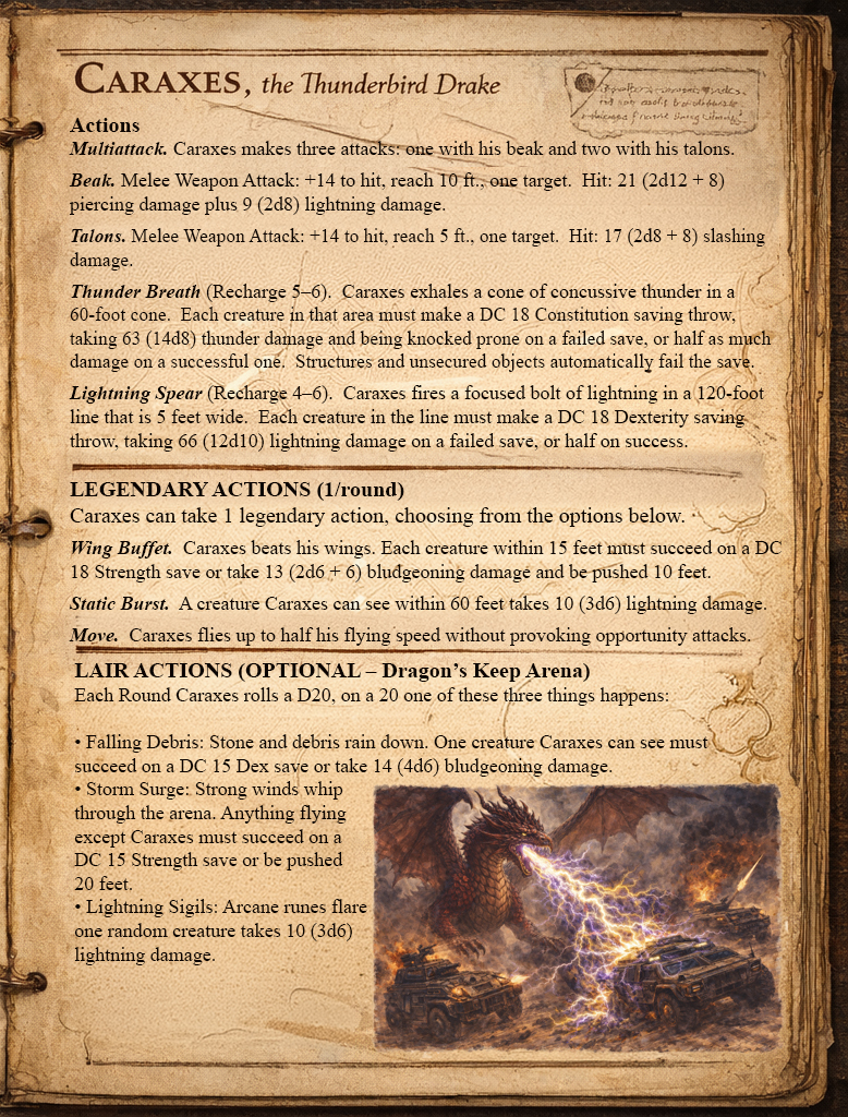 - Storm Surge: Strong winds whip through the arena. Anything flying except Caraxes must succeed on a DC 15 Strength save or be pushed 20 feet.