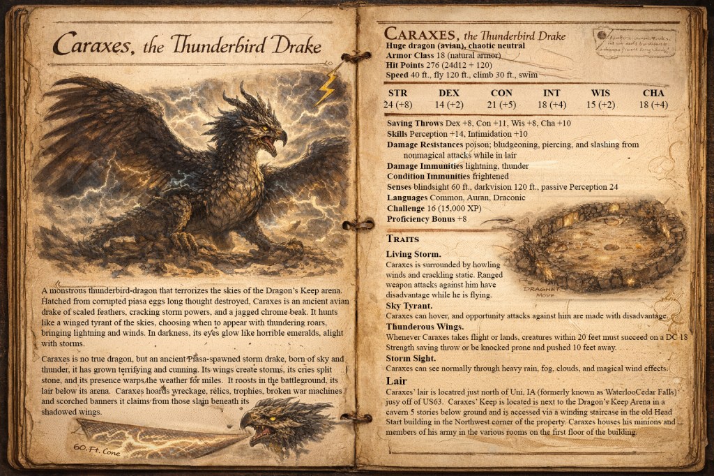 Caraxes is no true dragon, but an ancient Piasa-spawned storm drake, born of sky and thunder, it has grown terrifying and cunning. Its wings create storms, its cries split stone, and its presence warps the weather for miles. It roosts in the battleground, its lair below its arena. Caraxes hoards wreckage, relics, trophies, broken war machines and scorched banners it claims from those slain beneath its shadowed wings.