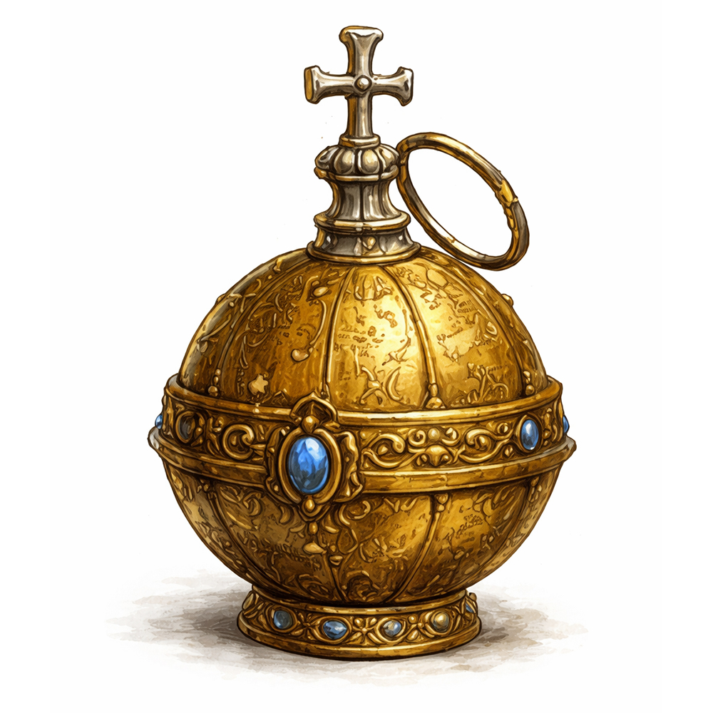 A gilded spherical reliquary engraved with tiny scriptural passages and capped with a silver pull-ring. When held, it is faintly warm to the touch and smells subtly of incense.