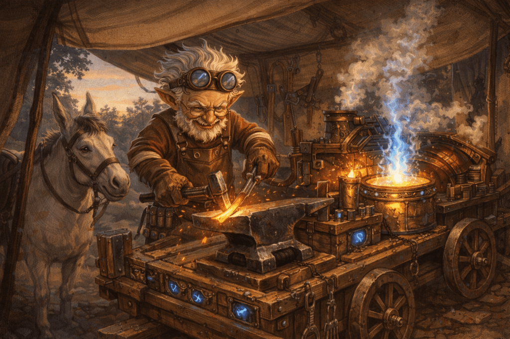 Among dwarven war caravans and gnomish tinker-carts alike, there are whispered tales of a forge that needs no coal, no wood, and no patient apprentice to pump the bellows. It travels. It unfolds. It burns with a steady blue-white flame that does not smoke, does not choke, and does not die.