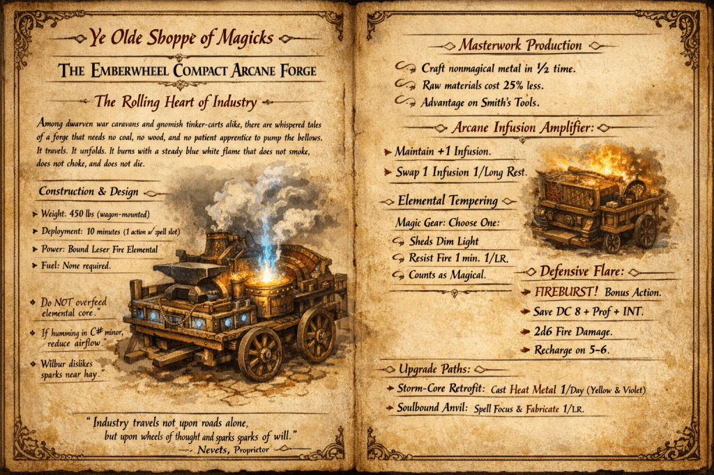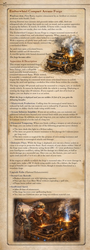 The Emberwheel Compact Arcane Forge is a wagon-mounted masterwork of brass, rune-etched iron, and articulated ingenuity. When stowed, it resembles a reinforced smith’s chest bolted to a cart bed. With a sequence of careful lever pulls and a whispered command word, its frame expands outward like a mechanical flower.
