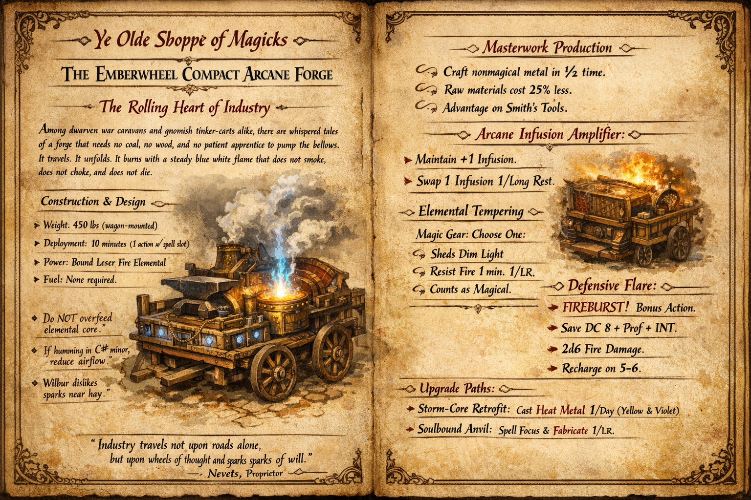 This arcane wagon-mounted forge is constructed of rune-etched iron, brass fittings, and a collapsible anvil assembly bound around a contained elemental flame. While stowed, it resembles a reinforced smith’s chest secured to a wagon bed. Speaking its command word causes articulated braces to unfold, raising the anvil and igniting a smokeless blue-white flame within the crucible.