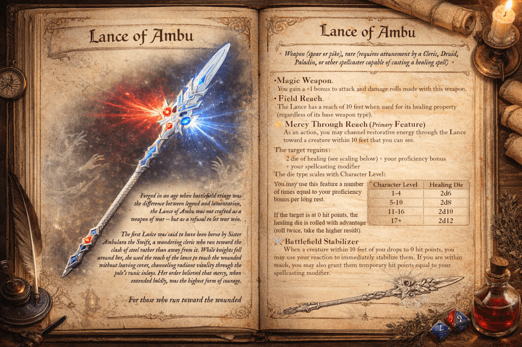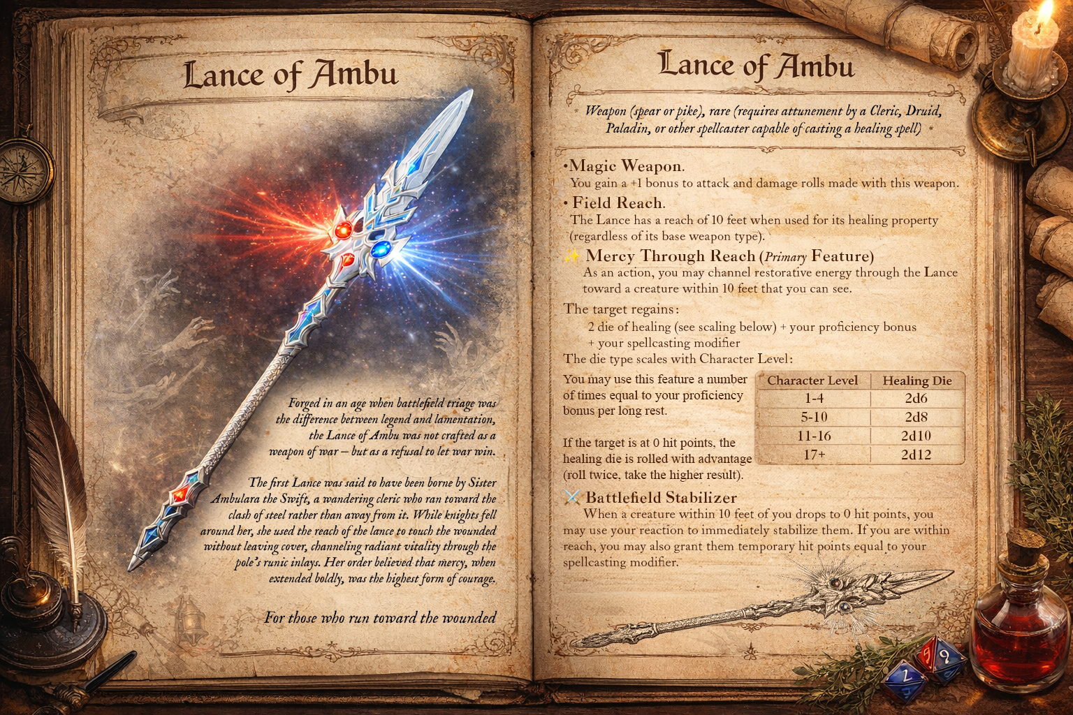 Forged in an age when battlefield triage was the difference between legend and lamentation, the Lance of Ambu was not crafted as a weapon of war — but as a refusal to let war win.