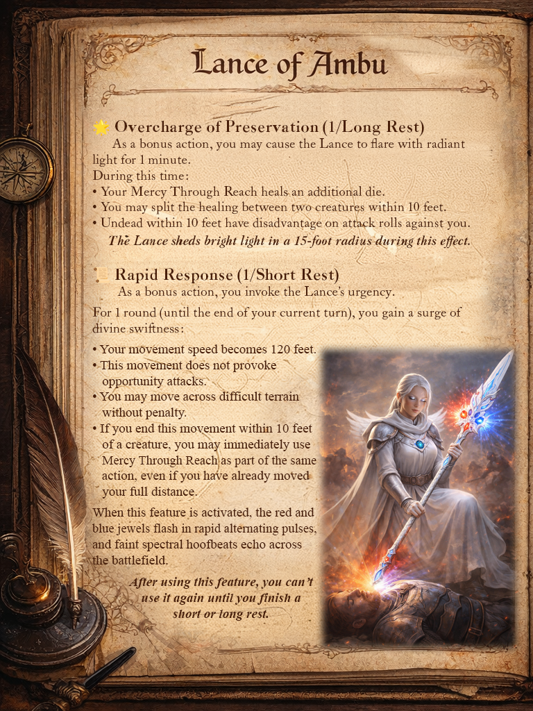The haft of the Lance is typically ash or silverwood, over laid with silver, etched with spiraling sigils of preservation. Its spearhead is blunted or leaf-shaped, glowing softly when life hangs in the balance. When activated, faint spectral hands seem to guide its motion, as though generations of battlefield healers stand behind the wielder.