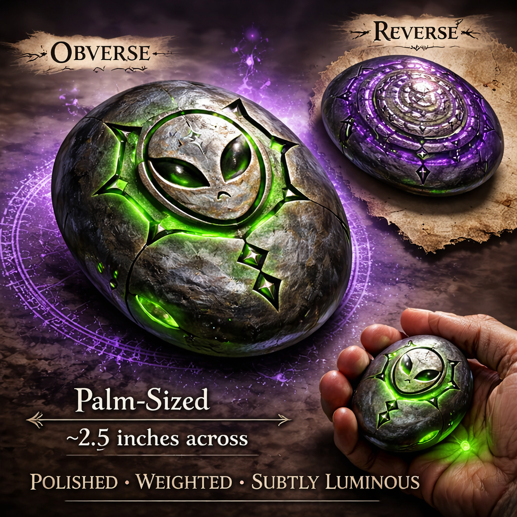 This smooth, palm-sized stone rests comfortably in the hand, its surface polished to a mirrorlike sheen that seems to drink in ambient light. It is neither warm nor cold, instead matching the bearer’s own temperature as if quietly attuning itself to their presence. Etched into its obverse is Nevets’ unmistakable sigil—an alien visage carved with unsettling precision, its expression subtly shifting when viewed from the corner of the eye. The reverse bears a continuous ring of finely incised runes forming a looping nursery rhyme, equal parts cautionary verse and playful dare.