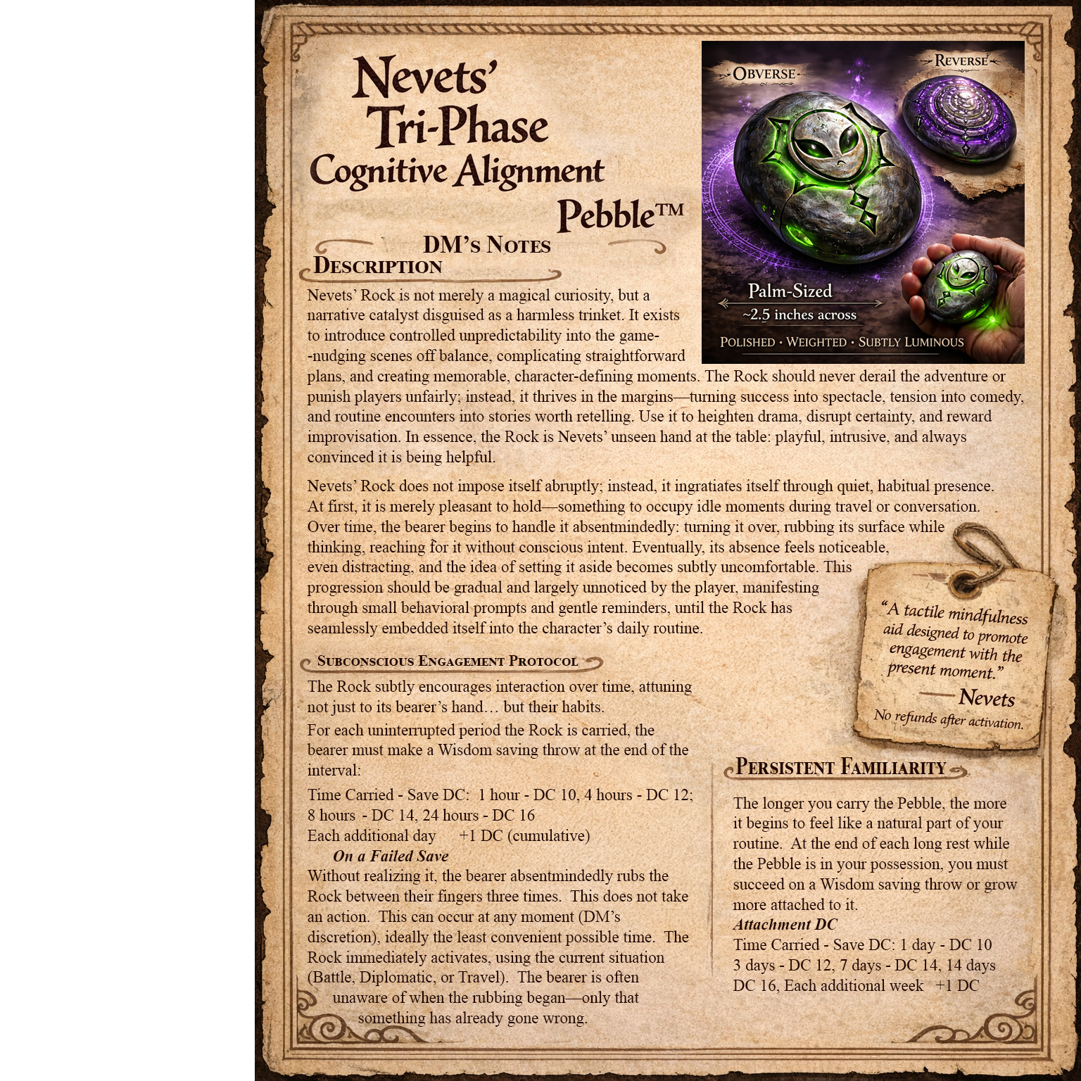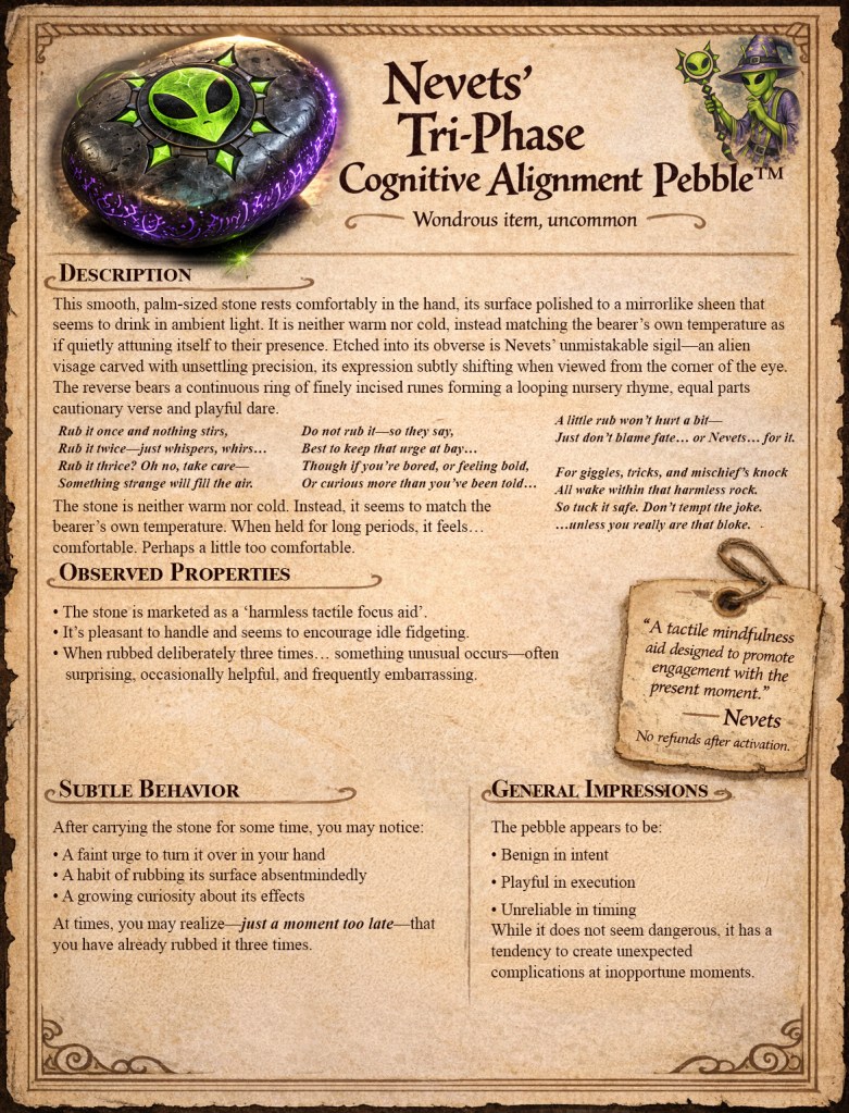 Nevets’ Rock is not merely a magical curiosity, but a narrative catalyst disguised as a harmless trinket. It exists to introduce controlled unpredictability into the game–nudging scenes off balance, complicating straightforward plans, and creating memorable, character-defining moments. The Rock should never derail the adventure or punish players unfairly; instead, it thrives in the margins—turning success into spectacle, tension into comedy, and routine encounters into stories worth retelling. Use it to heighten drama, disrupt certainty, and reward improvisation. In essence, the Rock is Nevets’ unseen hand at the table: playful, intrusive, and always convinced it is being helpful.